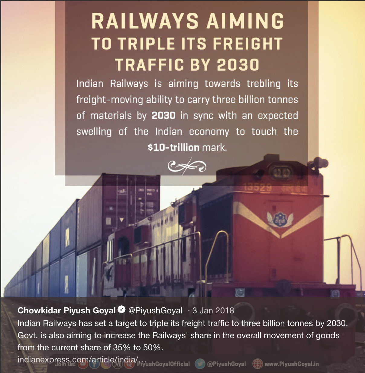 - Handle 50% of all freight in the country by 2030. (As of now only freight operations of the railways are profitable and are already the largest handlers of Coal, Iron, Cement, Steel, Food Grains, Fertilizers, Petroleum Products)